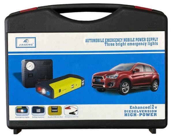 Arrancador de Batería 2 en 1 de Emergencia. Incluye 16800 mAh de capacidad para arrancar vehículos 12V y un Compresor de Aire integrado para inflar llantas. También funciona como power bank y linterna SOS. Máxima seguridad vial y portabilidad.