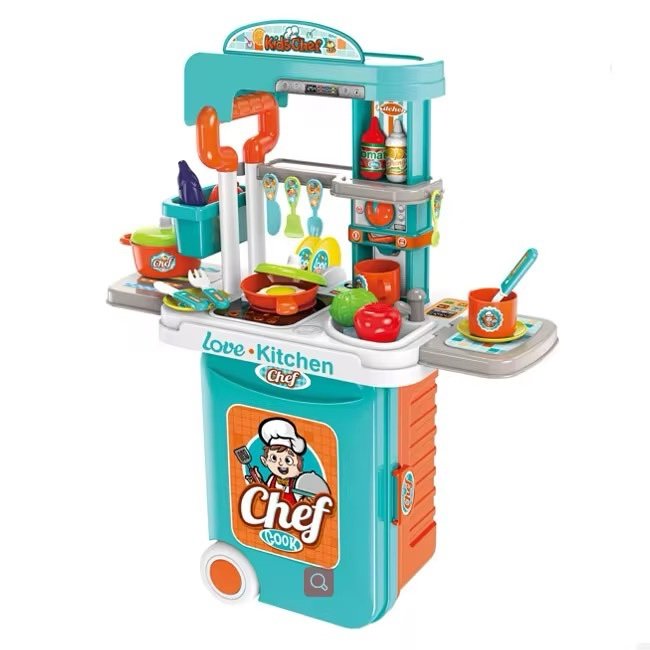 Juego Maleta de Chef 3 en 1 (956A). Cocina de juguete completa con estufa, fregadero y 28 accesorios (ollas, platos, cubiertos y alimentos). Ideal para juego de roles. Medidas armado: 66x21x50 cm.