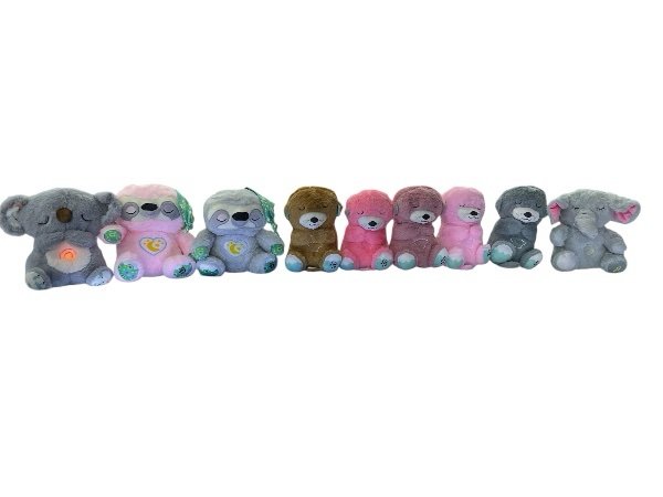 Muñeco de Peluche con Respiración Rítmica. Juguete calmante que simula el movimiento de la respiración para ayudar a la relajación y el sueño. Funciona con 2 pilas AA. Opciones: Nutria, Elefante, Oso Perezoso y Koala.