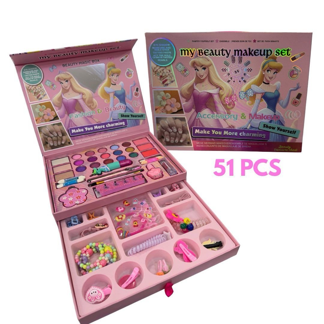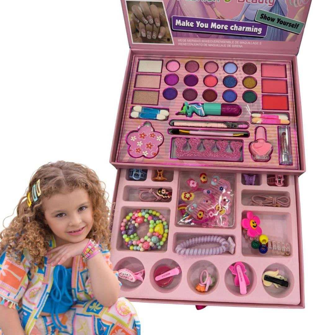 Despierta la pasión por la belleza y la creatividad de tu hija con nuestro Set de Maquillaje y Belleza de Lujo de 51 Piezas. Este kit no solo ofrece una colección masiva de cosméticos y accesorios, sino que garantiza una experiencia de juego completamente segura y fácil de limpiar para la tranquilidad de los padres.